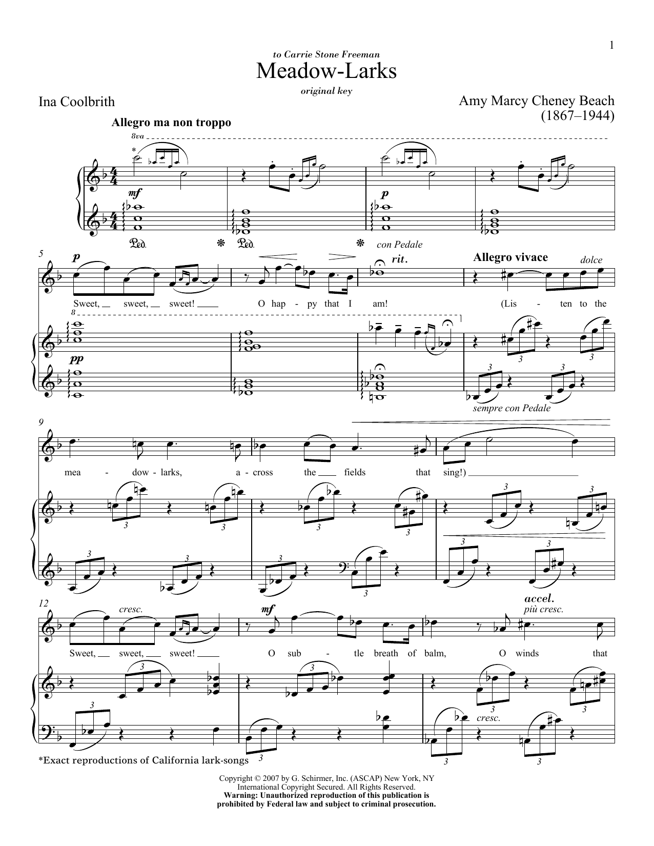 Download or print Amy Marcy Cheney Beach Meadow-Larks sheet music, chords and digital score arranged for Piano & Vocal. This Classical score includes 6 page(s).
