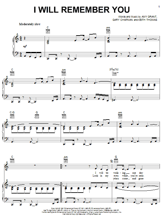 Download or print Amy Grant I Will Remember You sheet music, chords and digital score arranged for Piano, Vocal & Guitar Chords (Right-Hand Melody). This Christian score includes 6 page(s).