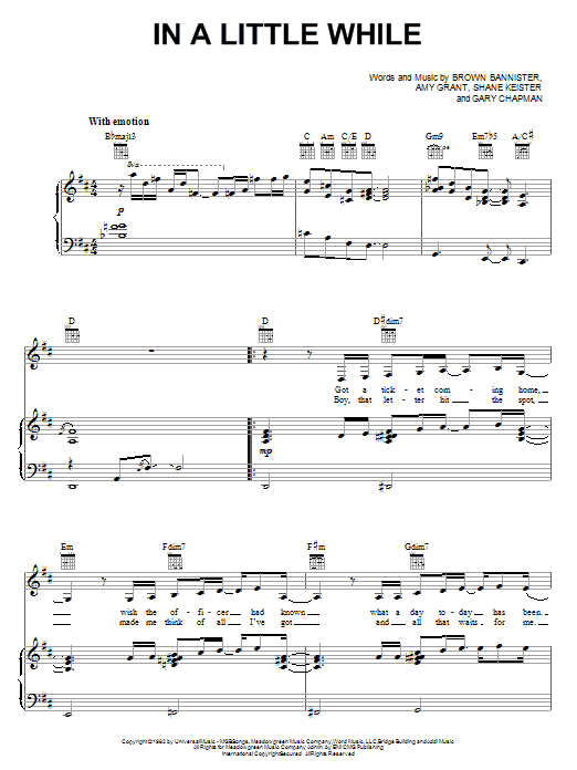 Download or print Amy Grant In A Little While sheet music, chords and digital score arranged for Piano, Vocal & Guitar Chords (Right-Hand Melody). This Christian score includes 6 page(s).