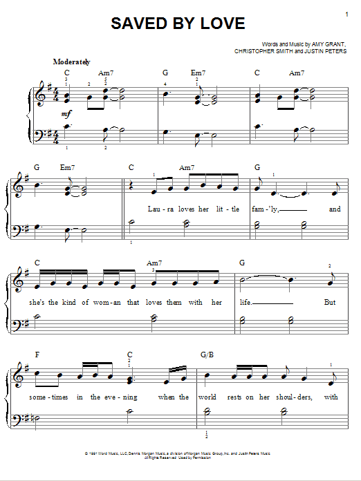 Download or print Amy Grant Saved By Love sheet music, chords and digital score arranged for Piano, Vocal & Guitar Chords (Right-Hand Melody). This Christian score includes 6 page(s).
