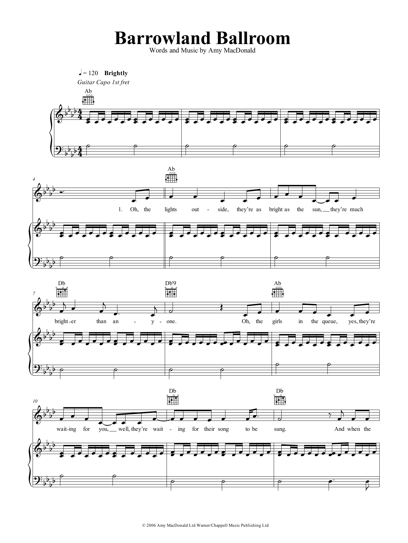 Download or print Amy MacDonald Barrowland Ballroom sheet music, chords and digital score arranged for Piano, Vocal & Guitar Chords (Right-Hand Melody). This Pop score includes 9 page(s).