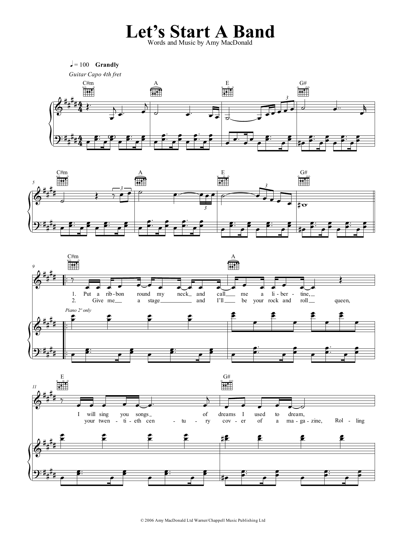 Download or print Amy MacDonald Let's Start A Band sheet music, chords and digital score arranged for Piano, Vocal & Guitar Chords (Right-Hand Melody). This Pop score includes 7 page(s).