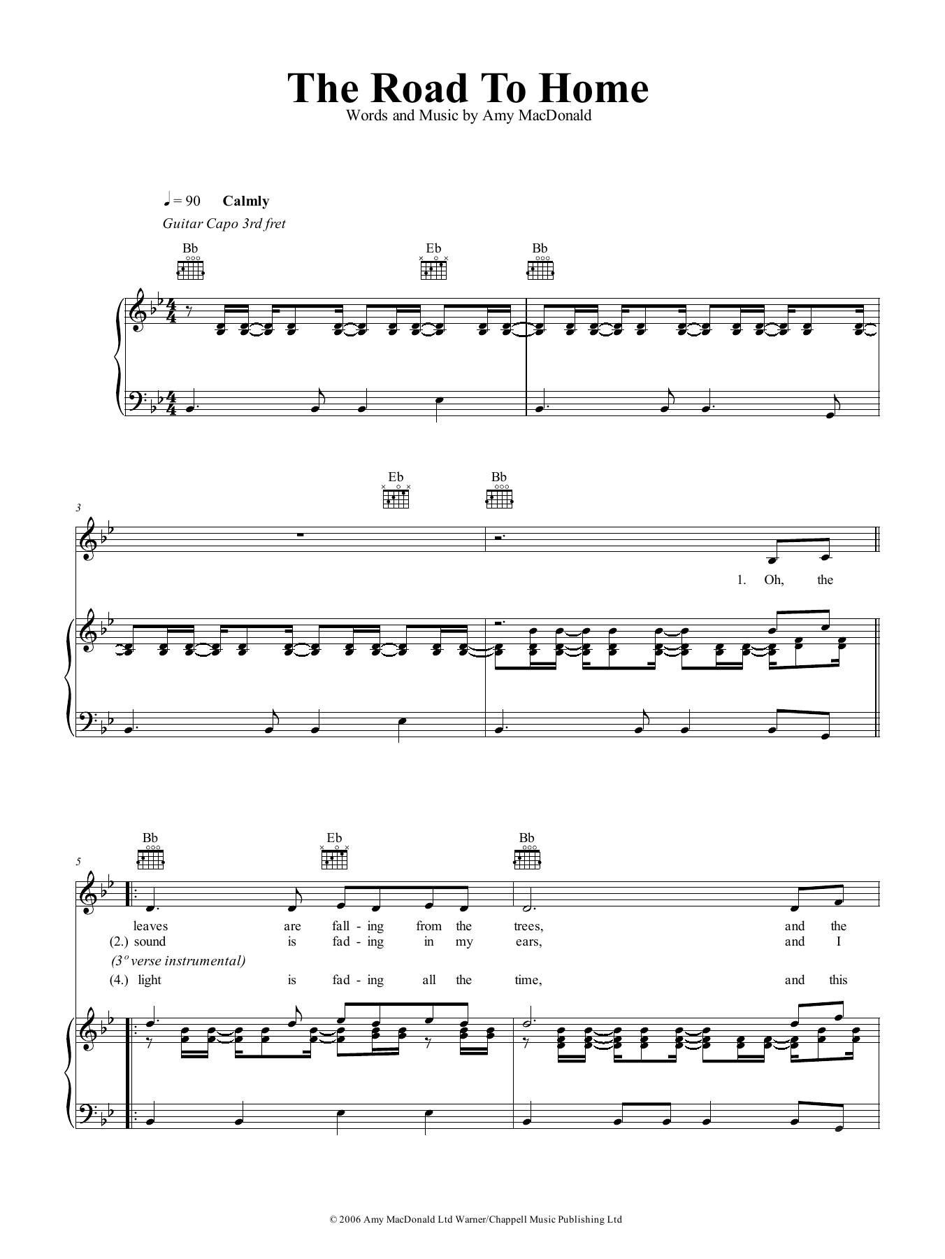 Download or print Amy MacDonald The Road To Home sheet music, chords and digital score arranged for Piano, Vocal & Guitar Chords (Right-Hand Melody). This Pop score includes 4 page(s).