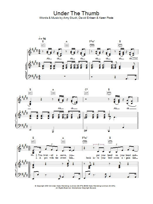 Download or print Amy Studt Under The Thumb sheet music, chords and digital score arranged for Lead Sheet / Fake Book. This Pop score includes 2 page(s).