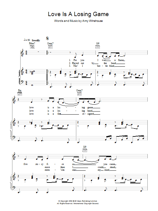 Download or print Amy Winehouse Love Is A Losing Game sheet music, chords and digital score arranged for Guitar Chords/Lyrics. This Pop score includes 2 page(s).