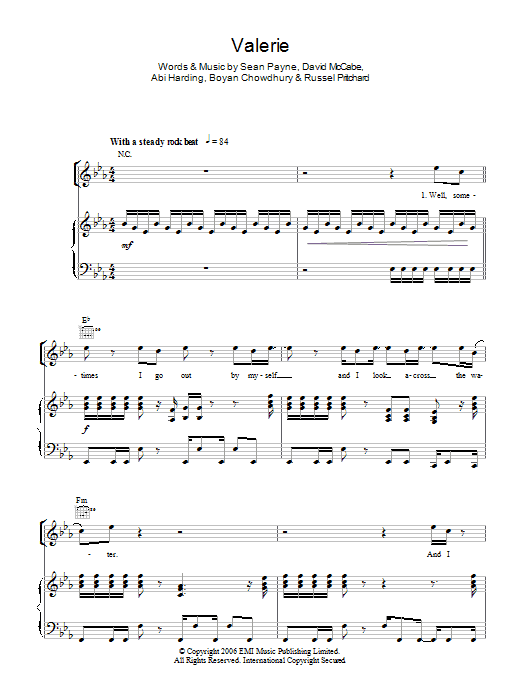Download or print Amy Winehouse Valerie sheet music, chords and digital score arranged for Piano, Vocal & Guitar Chords (Right-Hand Melody). This Jazz score includes 7 page(s).