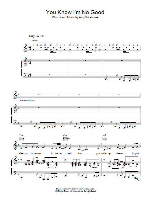Download or print Amy Winehouse You Know I'm No Good sheet music, chords and digital score arranged for Guitar Chords/Lyrics. This Pop score includes 2 page(s).
