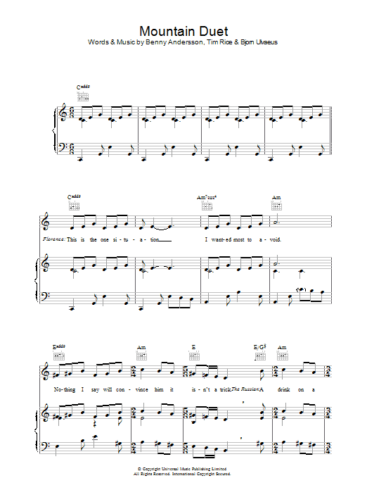 Download or print Tim Rice Mountain Duet sheet music, chords and digital score arranged for Piano, Vocal & Guitar Chords. This Musical/Show score includes 11 page(s).