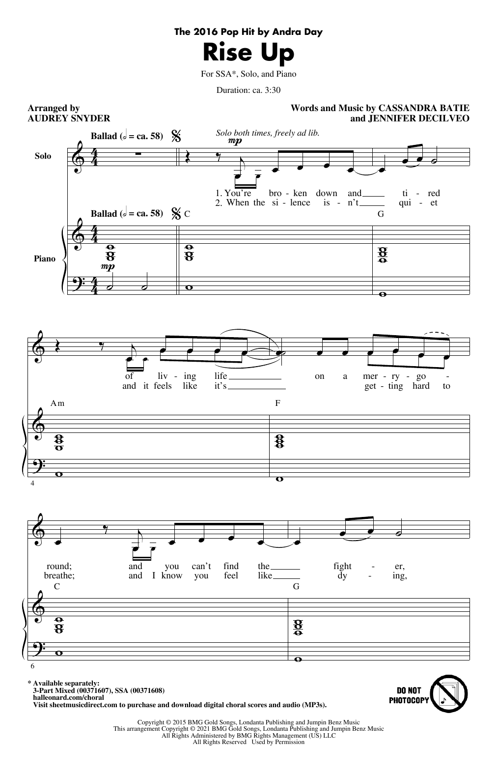 Download or print Andra Day Rise Up (arr. Audrey Snyder) sheet music, chords and digital score arranged for SSA Choir. This Inspirational score includes 14 page(s).