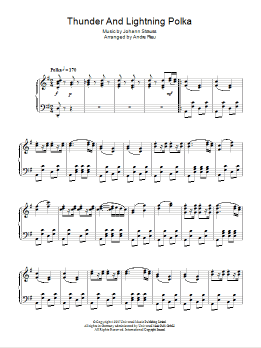 Download or print Andre Rieu Thunder And Lightning Polka sheet music, chords and digital score arranged for Piano Solo. This Classical score includes 4 page(s).