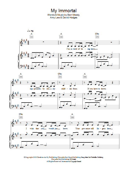Download or print Andrea Begley My Immortal sheet music, chords and digital score arranged for Piano, Vocal & Guitar Chords. This Pop score includes 4 page(s).