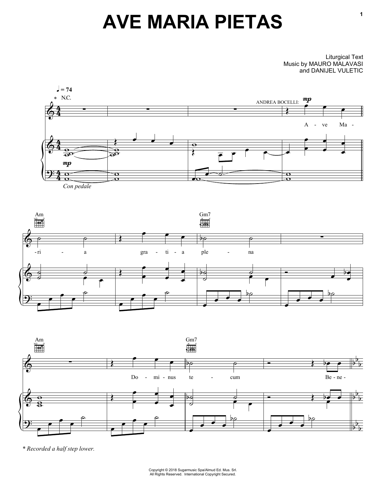 Download or print Andrea Bocelli Ave Maria Pietas (feat. Aida Garifullina) sheet music, chords and digital score arranged for Piano, Vocal & Guitar Chords (Right-Hand Melody). This Spanish score includes 5 page(s).