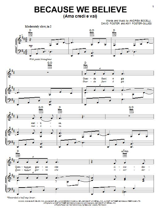 Download or print Andrea Bocelli Because We Believe sheet music, chords and digital score arranged for Piano, Vocal & Guitar Chords (Right-Hand Melody). This Inspirational score includes 10 page(s).