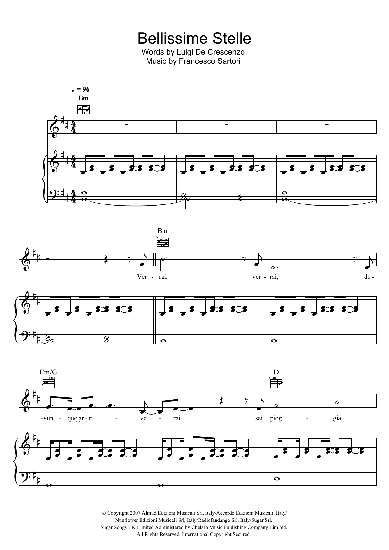 Download or print Andrea Bocelli Bellissime Stelle sheet music, chords and digital score arranged for Piano, Vocal & Guitar Chords. This Classical score includes 8 page(s).