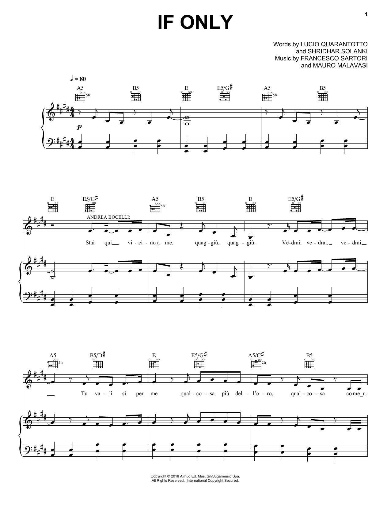 Download or print Andrea Bocelli If Only (feat. Dua Lipa) sheet music, chords and digital score arranged for Piano, Vocal & Guitar Chords (Right-Hand Melody). This Spanish score includes 5 page(s).
