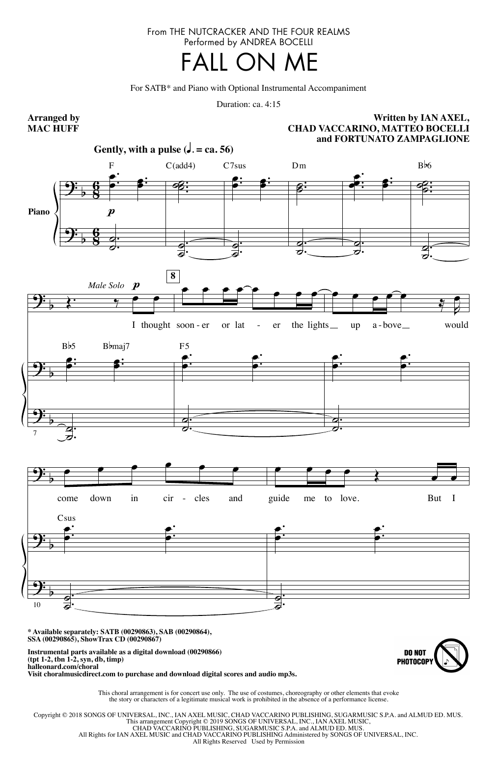 Download or print Andrea Bocelli & Matteo Bocelli Fall On Me (from The Nutcracker and the Four Realms) (arr. Mac Huff) sheet music, chords and digital score arranged for SAB Choir. This Concert score includes 11 page(s).