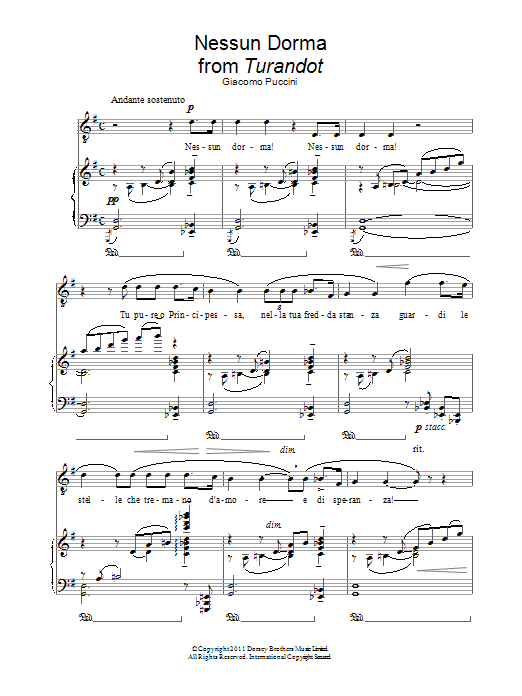 Download or print Andrea Bocelli Nessun Dorma sheet music, chords and digital score arranged for Piano & Vocal. This Classical score includes 4 page(s).