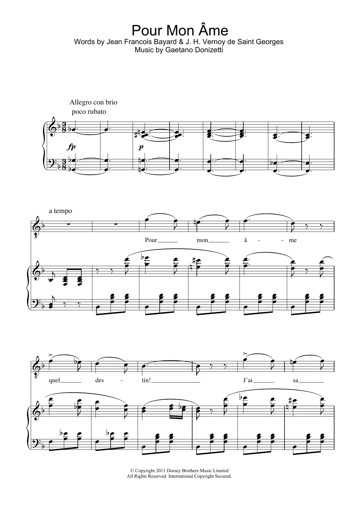 Download or print Andrea Bocelli Pour Mon Ame (from La Fille du Regiment) sheet music, chords and digital score arranged for Piano & Vocal. This Classical score includes 6 page(s).