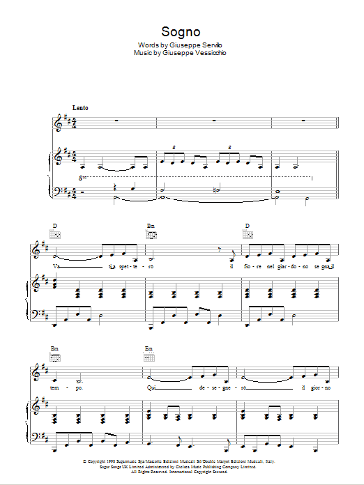 Download or print Andrea Bocelli Sogno sheet music, chords and digital score arranged for Piano & Vocal. This Classical score includes 6 page(s).