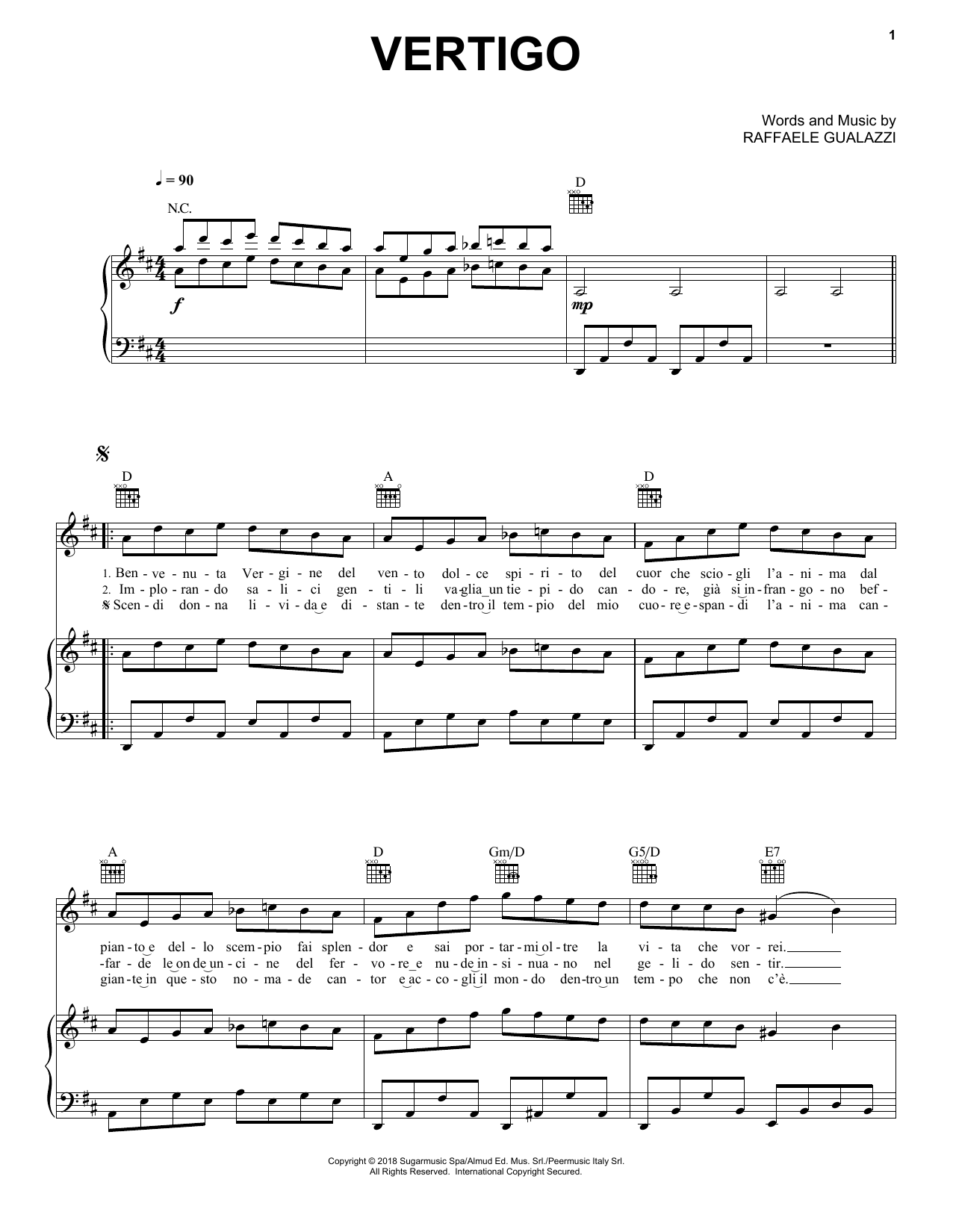 Download or print Andrea Bocelli Vertigo sheet music, chords and digital score arranged for Piano, Vocal & Guitar Chords (Right-Hand Melody). This Spanish score includes 9 page(s).
