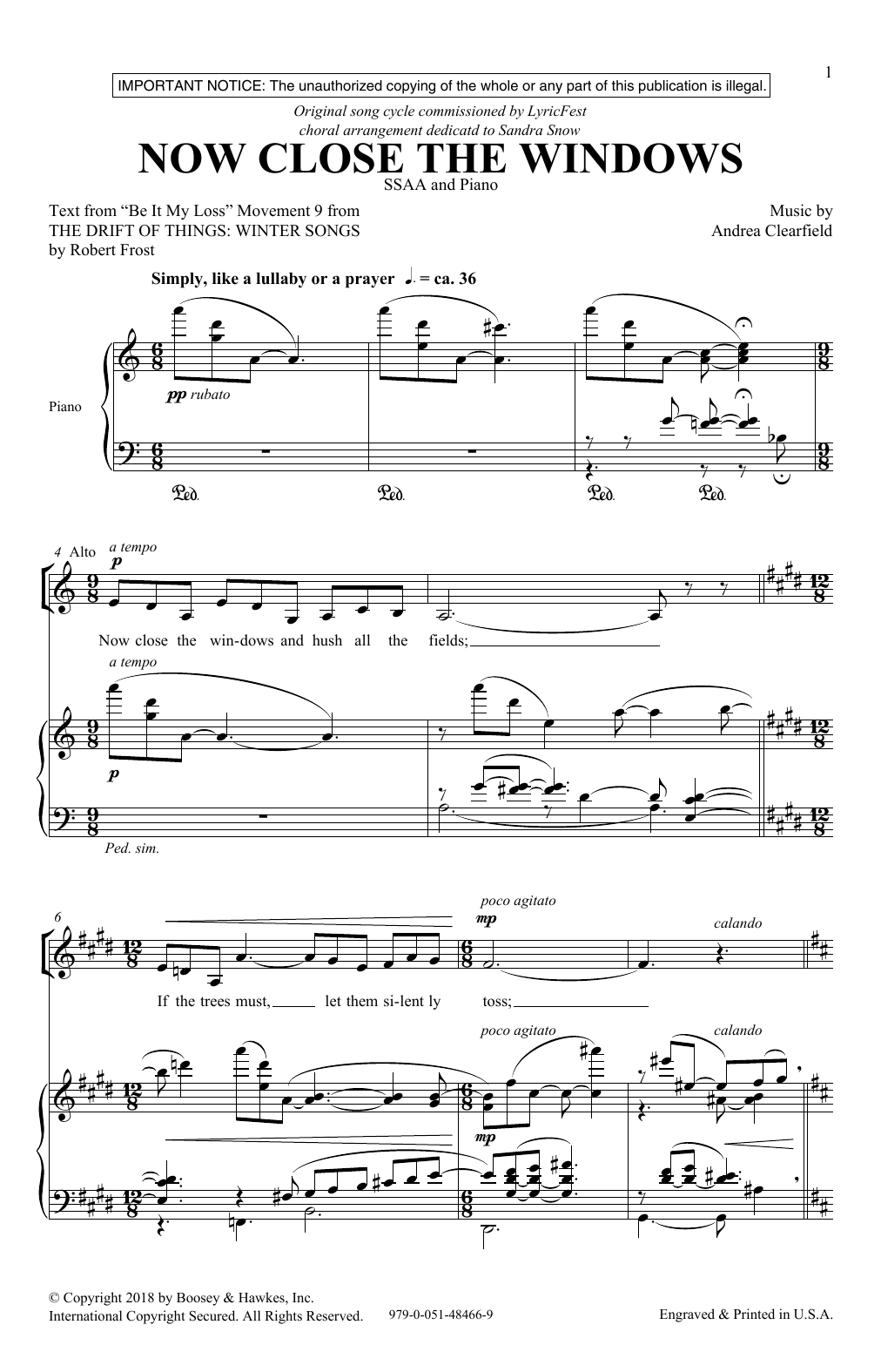 Download or print Andrea Clearfield Now Close The Windows sheet music, chords and digital score arranged for SSA Choir. This Concert score includes 6 page(s).