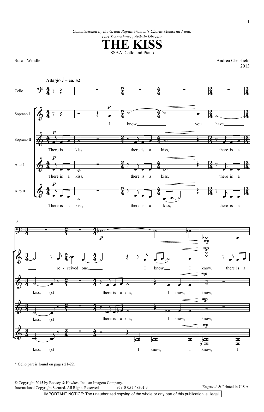 Download or print Andrea Clearfield The Kiss sheet music, chords and digital score arranged for SSA Choir. This Concert score includes 22 page(s).