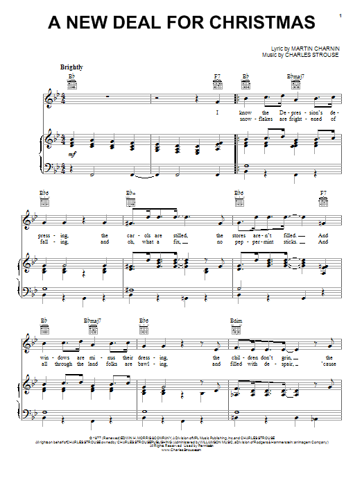 Download or print Andrea McArdle A New Deal For Christmas sheet music, chords and digital score arranged for Piano, Vocal & Guitar Chords (Right-Hand Melody). This Children score includes 5 page(s).