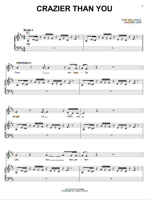 Download or print Andrew Lippa Crazier Than You sheet music, chords and digital score arranged for Piano & Vocal. This Musical/Show score includes 11 page(s).