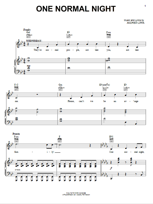 Download or print Andrew Lippa One Normal Night sheet music, chords and digital score arranged for Piano & Vocal. This Broadway score includes 11 page(s).