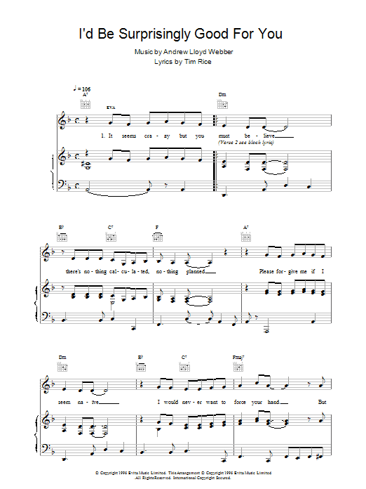 Download or print Andrew Lloyd Webber I'd Be Surprisingly Good For You sheet music, chords and digital score arranged for Piano, Vocal & Guitar Chords (Right-Hand Melody). This Musical/Show score includes 6 page(s).