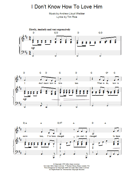 Download or print Andrew Lloyd Webber I Don't Know How To Love Him sheet music, chords and digital score arranged for Solo Guitar. This Film/TV score includes 3 page(s).