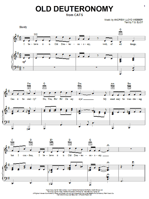 Download or print Andrew Lloyd Webber Old Deuteronomy (from Cats) sheet music, chords and digital score arranged for Piano & Vocal. This Musical/Show score includes 3 page(s).