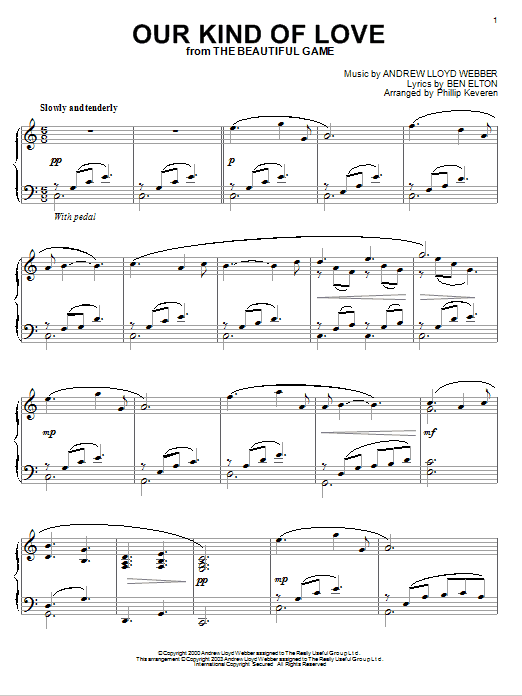 Download or print Andrew Lloyd Webber Our Kind Of Love (from The Beautiful Game) (arr. Phillip Keveren) sheet music, chords and digital score arranged for Piano Solo. This Love score includes 3 page(s).
