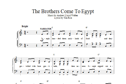 Download or print Andrew Lloyd Webber The Brothers Come To Egypt sheet music, chords and digital score arranged for Piano, Vocal & Guitar Chords. This Musical/Show score includes 1 page(s).