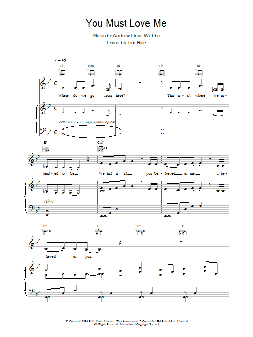 Download or print Andrew Lloyd Webber You Must Love Me (from Evita) sheet music, chords and digital score arranged for Piano & Vocal. This Broadway score includes 4 page(s).