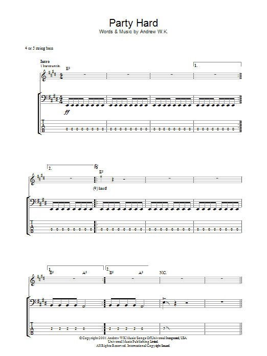 Download or print Andrew W.K. Party Hard sheet music, chords and digital score arranged for Bass Guitar Tab. This Metal score includes 5 page(s).