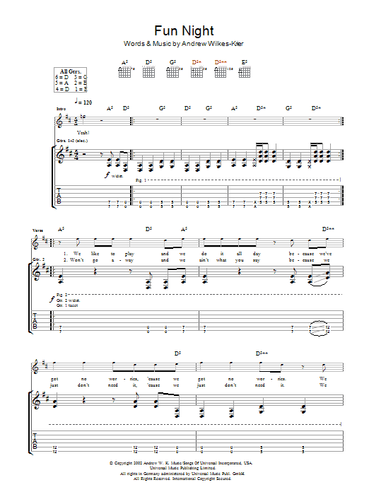 Download or print Andrew W.K. Fun Night sheet music, chords and digital score arranged for Guitar Tab. This Rock score includes 3 page(s).