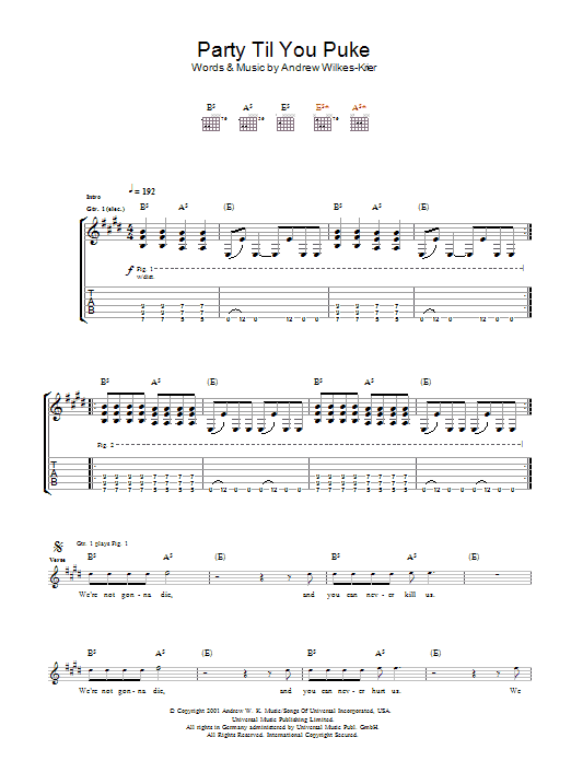 Download or print Andrew W.K. Party Til You Puke sheet music, chords and digital score arranged for Guitar Tab. This Rock score includes 4 page(s).