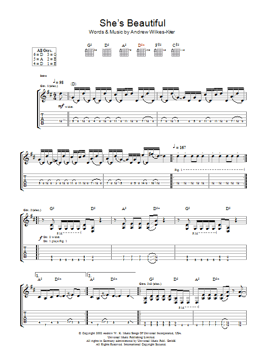 Download or print Andrew W.K. She Is Beautiful sheet music, chords and digital score arranged for Guitar Tab. This Rock score includes 6 page(s).