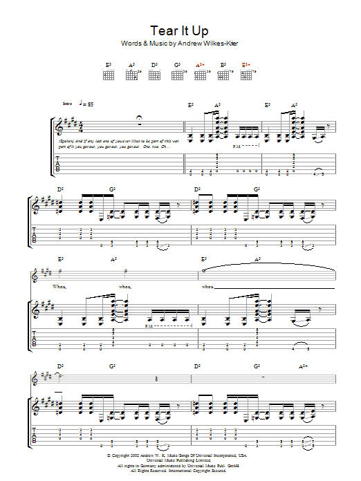 Download or print Andrew W.K. Tear It Up sheet music, chords and digital score arranged for Guitar Tab. This Rock score includes 7 page(s).