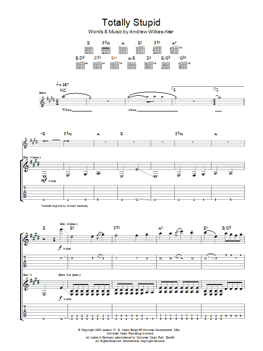 Download or print Andrew W.K. Totally Stupid sheet music, chords and digital score arranged for Guitar Tab. This Rock score includes 10 page(s).