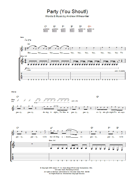 Download or print Andrew W.K. We Party (You Shout) sheet music, chords and digital score arranged for Guitar Tab. This Rock score includes 6 page(s).