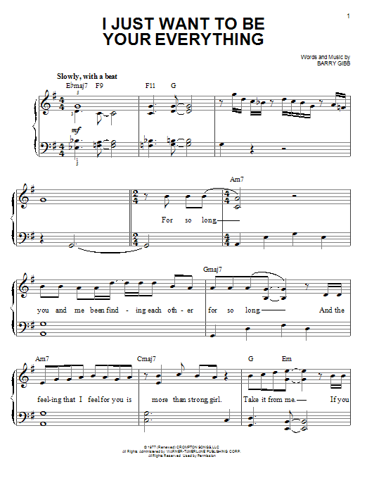 Download or print Andy Gibb I Just Want To Be Your Everything sheet music, chords and digital score arranged for Piano, Vocal & Guitar Chords (Right-Hand Melody). This Pop score includes 5 page(s).