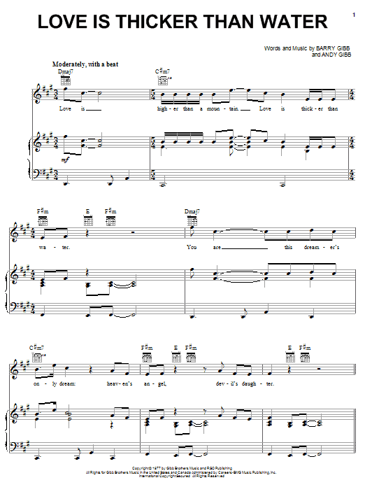 Download or print Andy Gibb Love Is Thicker Than Water sheet music, chords and digital score arranged for Lead Sheet / Fake Book. This Pop score includes 1 page(s).