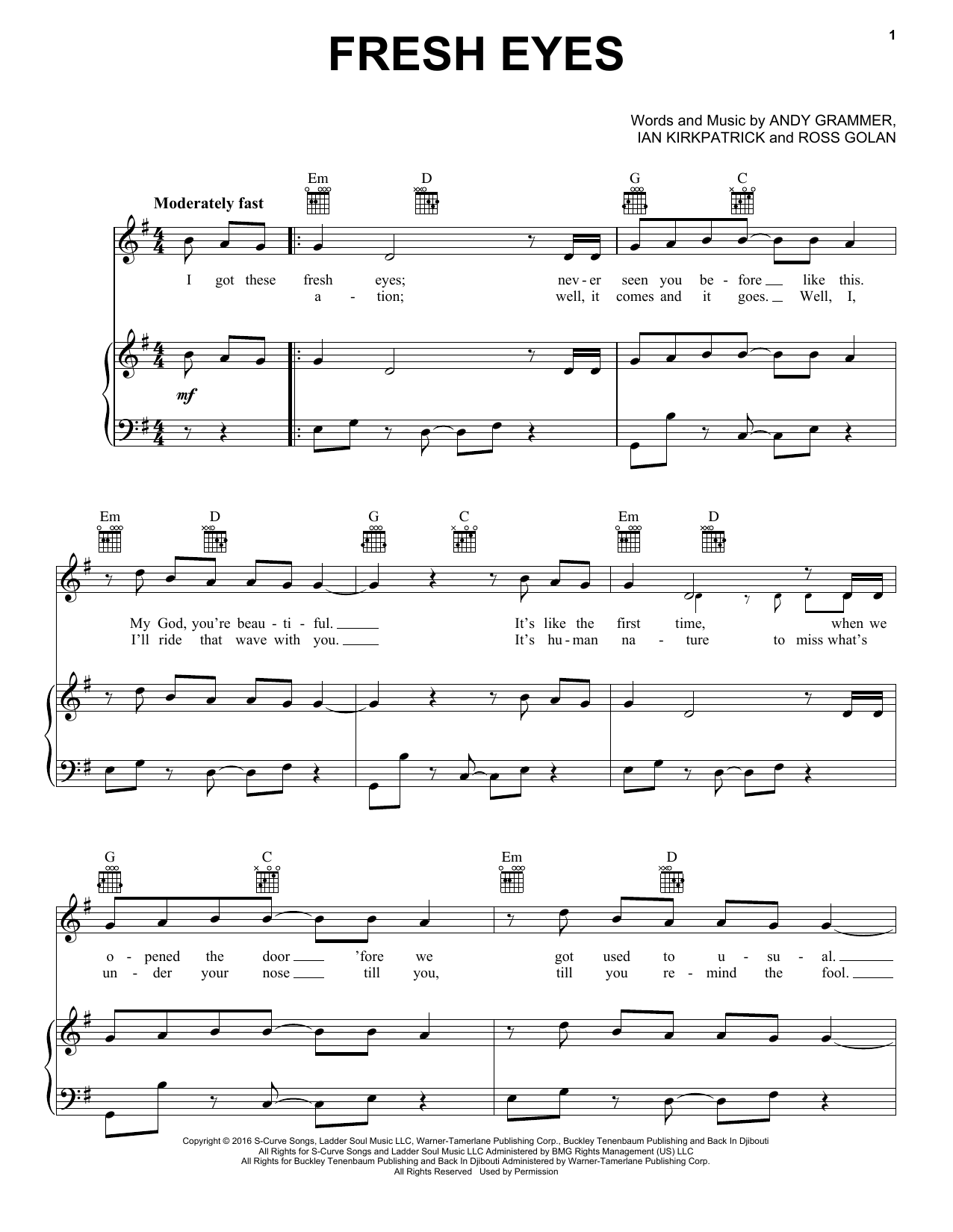 Download or print Andy Grammer Fresh Eyes sheet music, chords and digital score arranged for Piano, Vocal & Guitar Chords (Right-Hand Melody). This Pop score includes 5 page(s).