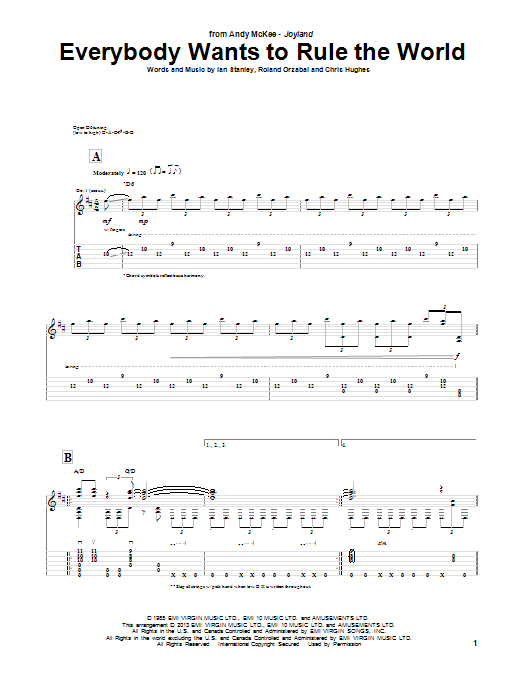 Download or print Andy McKee Everybody Wants To Rule The World sheet music, chords and digital score arranged for Guitar Tab. This Folk score includes 7 page(s).