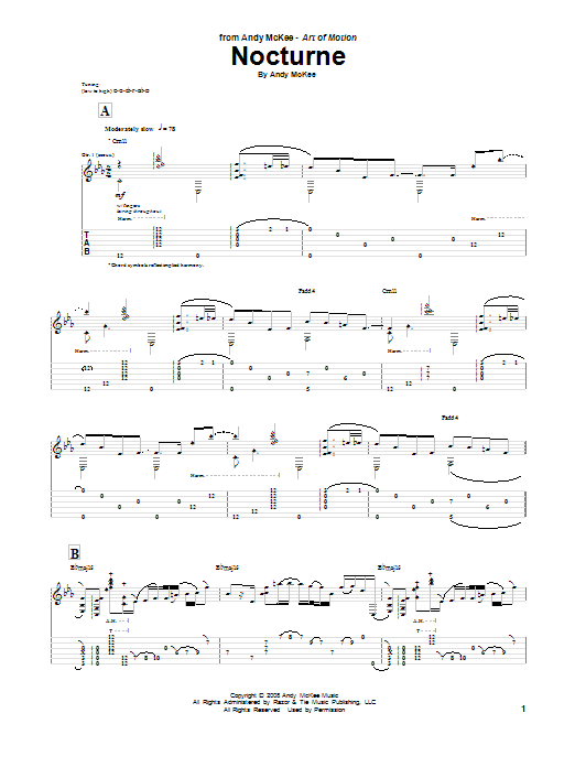 Download or print Andy McKee Nocturne sheet music, chords and digital score arranged for Guitar Tab. This Pop score includes 4 page(s).
