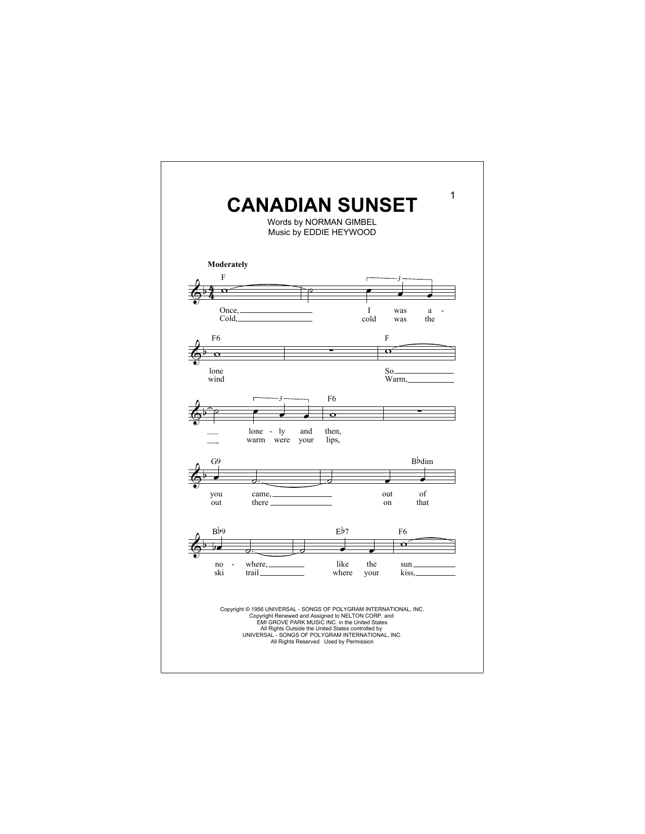 Download or print Hugo Winterhalter/E. Heywood Canadian Sunset sheet music, chords and digital score arranged for Lead Sheet / Fake Book. This Jazz score includes 3 page(s).