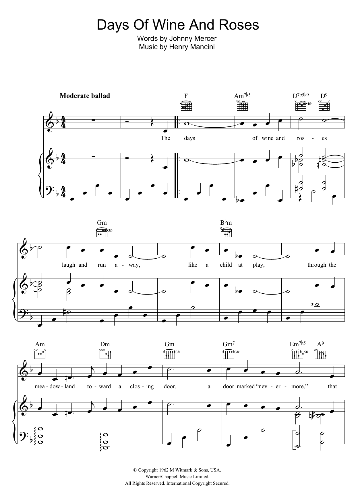 Download or print Andy Williams Days Of Wine And Roses sheet music, chords and digital score arranged for Piano & Vocal. This Jazz score includes 4 page(s).