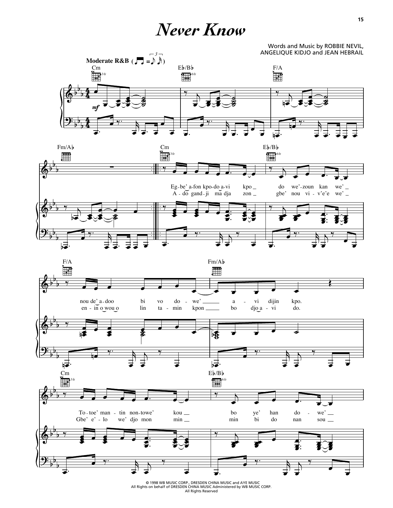 Download or print Angelique Kidjo Never Know sheet music, chords and digital score arranged for Piano, Vocal & Guitar Chords (Right-Hand Melody). This Hip-Hop score includes 6 page(s).